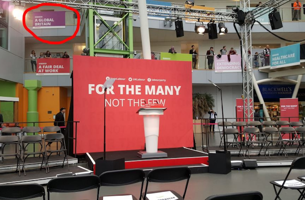 However, it’s another message that has caught Mr S’s attention. In the backdrop to the stage, one of the signs reads ‘a global Britain’. This is a phrase Theresa May has repeatedly used to describe her government’s Brexit position — and she even gave a speech by this title.