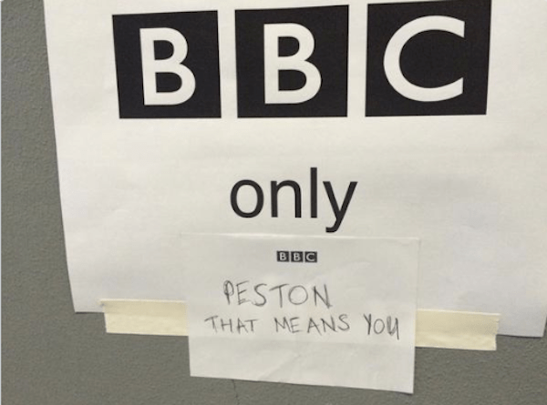 Unsurprisingly the news does not appear to have gone down too well with some members of the Beeb. Stephen Walker, the BBC Northern Ireland Political Correspondent, has shared a photo of a sign outside a BBC press area at Tory conference which has been ‘edited’ to ban Peston from entering.