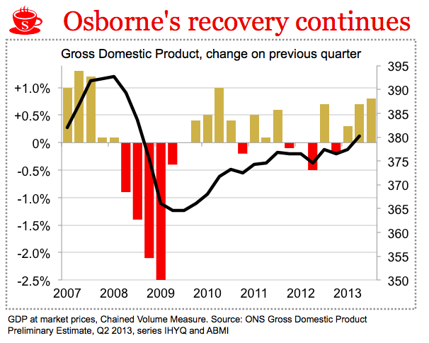 As ministers had hoped, today’s first estimate of GDP figures from the Office for National Statistics shows that the economy grew by 0.8 per cent in the third quarter of 2013. Citi had predicted 0.7 per cent, and while the economy is still 2.5 per cent below its pre-recession peak, ministers now have evidence of an upward trajectory, or, as the Treasury is describing it this morning, ‘real momentum’.