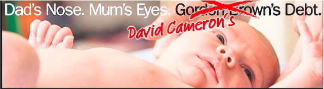 Cameron’s original poster claimed a baby born in Britain is saddled with £17,000 of Brown’s debt. Under the plans the Tories are pursuing – ie, raise spending