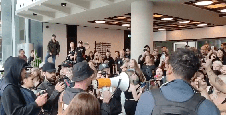 Footage uploaded today show dozens of protestors thronging the lobby of the building which is owned by ITN and provides news bulletins for the ITV and Channel 4 stations. A livestream shows masked police officers blockading the protestors outside from those inside, with some of those involved shouting abuse at the Met’s finest.