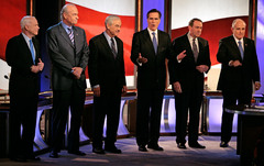 McCain then gets a question on immigration, the Achilles heel of his campaign. He stresses securing the borders but supports the idea of their being an eventual path to citizenship and reminds people that these people are “God’s children.” Romney tries to draw a contrast stressing his new hard-line stance on the issue. Rudy chooses to emphasise his competence and ability to enforce the law but doesn’t back away from the idea of a path to citizenship. Then comes a ding-dong between McCain and Romney over Romney’s criticism of him. McCain tells Romney, “You can spend your entire fortune on these attack ads calling my plan amnesty and it still won’t be true.” He then tells Romney that he is not going to call up soldiers in Iraq to inform them that he’s deporting their grandmothers. Thompson then joins in the mass assault on Romney. Romney claims that the quote Thompson is using was wrong, McCain jokes that if you change position as often as Romney does you’re going to get misquoted from time to time. Giuliani then, sensibly points out that Ronald Reagan did do amnesty, and says that he’d be in one of “Mitt’s negative commercials.” By my count, every candidate has attacked Romney while the others—with the exception of the attacks on Ron Paul during the foreign policy section—are playing nice.