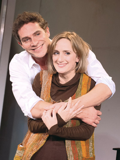 A wistful tune Franklin picks out on the piano turns out to be from his first hit — before he sold out. Then, in an ambivalent moment outside the divorce court, Franklin and Beth (Clare Foster) sing a charged duet we learn later was their wedding song. A simple device this; but it works. It takes a virtuoso turn when, breaking with his partner on live TV, Damian Humbley (as Charley Kringas) stunningly recreates with just his voice the piano, phone and typewriter we’ll later see the two hopefuls using to write their first songs.