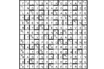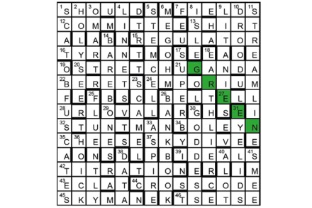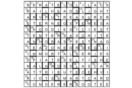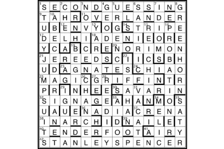 The unclued lights are anagrams of words meaning ‘blessing’, hence 43A MIXED BLESSINGS. The words are 11A AGREEMENT, 31A BENISON, 34A CONSENT, 40A BOON, 10D PERMISSION, 13D GODSEND, 15D SANCTION and 27D DARSHAN. First prize Ian Dempsey, Oldwick, New Jersey Runners-up Dr Simon Shaw, Goosnargh, Lancs; Rhidian Llewellyn, Minchinhampton, Glos