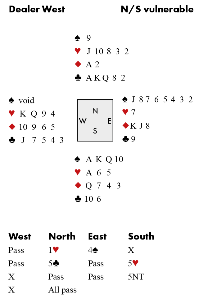 West could have collected 100 in 5♥️ undoubled, but he understandably thought it could well be more and attached a double. Most players would shrug and pass this out, thinking they had done their best and it was bad luck if it went off. But Sweden’s Simon Ekenberg is not most players! He analysed the situation perfectly when he ran to 5NT, and West’s double was no surprise to anyone.