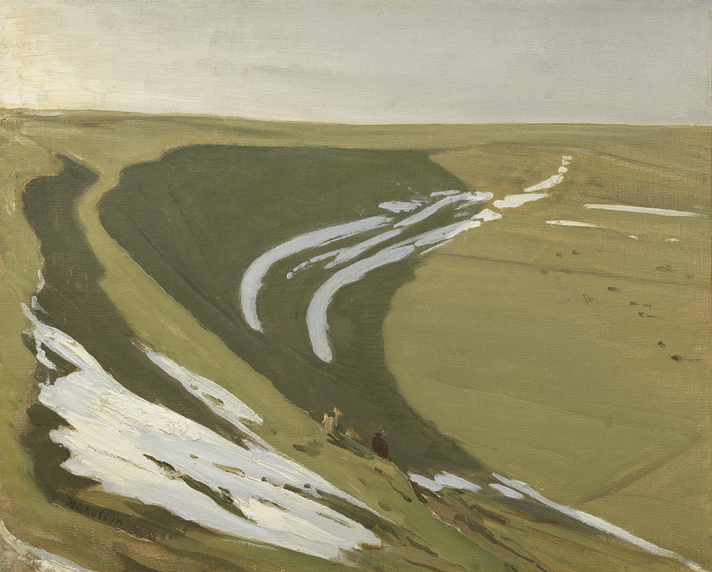 There are times when he approaches abstraction, especially in his landscapes: when a bold sweep of white will serve for a fall of snow (see below). Take ‘Mending the Nets, Rottingdean’ (1909), a memorably spare seascape with the nets between the men’s hands depicted in one sure stroke of paint, or the evocatively simple ‘Sunset’ (1912).